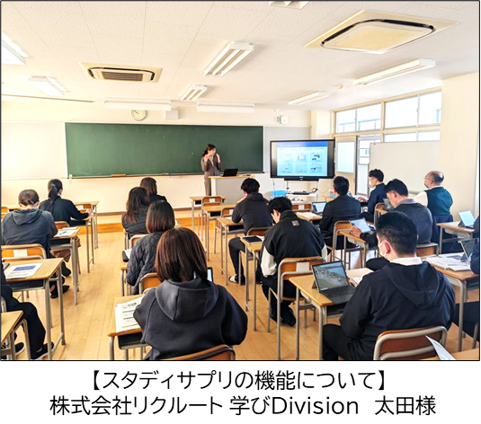 前半に、株式会社リクルートの太田様からスタディサプリの基本機能や個別最適化された学習指導を強化していくための方策、松高タイムでの活用、多様な進路希望に応じた学習・進路指導・資格検定対策や、新たに追加される機能、さらなる効果的な活用方法などを教えていただきました。