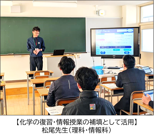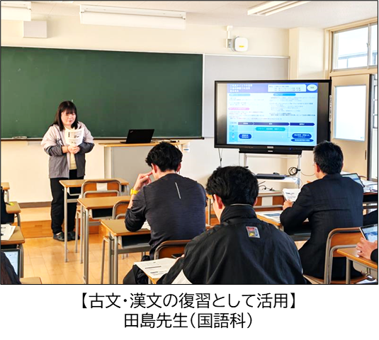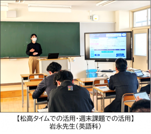 後半は、岩永先生(英語)、田島先生(国語)、松尾先生(化学・情報)の3名の先生方から、松浦高校での活用事例を共有し、これから松浦高校として、大学・短大・専門学校・公務員・就職までの多様な進路希望を実現するための個別最適な学びを実現していくために活用を進めていきたいと思います。