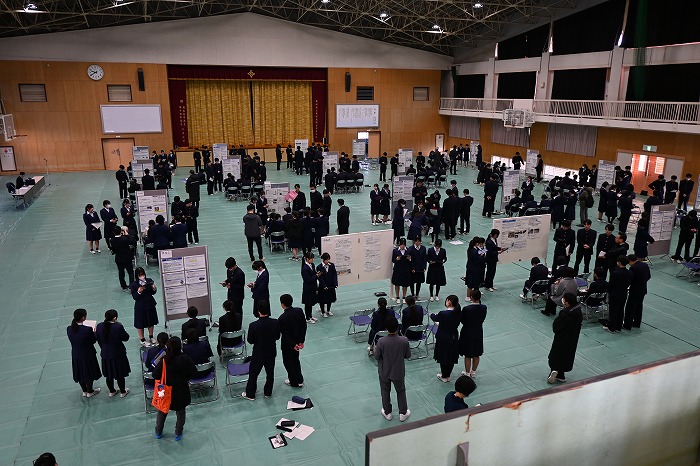 令和7年度2月2日(月)に2年普通科総合的な探究の時間の本発表(ポスター発表会)が行われました。39グループがそれぞれのテーマでポスター作成をし、発表をしました。地域の方にも多数参観していただき、ありがとうございました。