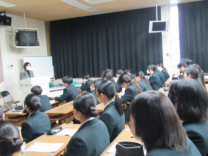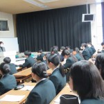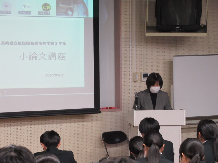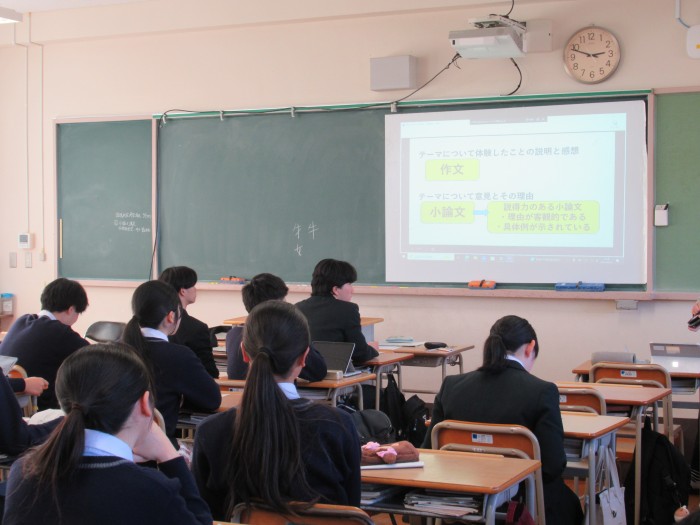 2月3日(火)LHRにて2年生が全員、来月受験する小論文模試受験に向けて書き方を学ぶために、Gakkenの本間先生に来ていただき、講演を聴きました。「小論文とは何か」ということから、具体的にどのように組み立ていくのかを教えていただきました。生徒たちはメモを取りながら真剣に耳を傾けていました。