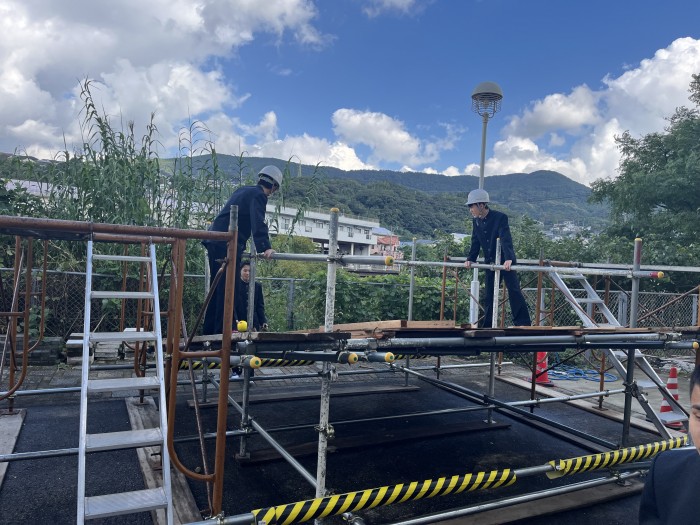 土木科では、単管パイプで作ったシーソーやピンボール、木工作品の販売、高所作業車の乗車体験