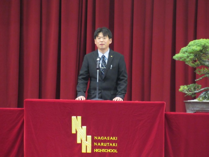 最初の新任式では、今年度から赴任された川原校長と6名の先生の紹介とあいさつがあり、生徒たちは新しく赴任された先生の言葉を真剣に聴き入っていました。