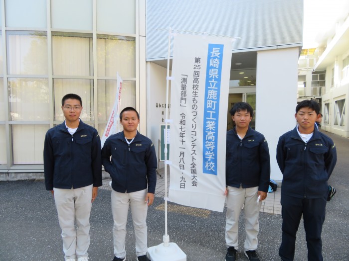 11月8日、9日に高知県立高知工業高等学校で実施されました。全国大会には4年ぶり6回目の出場で、測量部門九州ブロック代表として土木技術部3年岩永陽星、来山孝志、井元健太、2年光武優心のチームが出場しました。 各ブロック大会を勝ち抜いた9校と開催県枠1校の計10校で競われました。大会当日は雨の影響で雨天時の課題で実施されました。選手は設定タイムどおり計算を終え、自分達の力を100%発揮しましたが、惜しくも4位という結果でした。応援ありがとうございました。