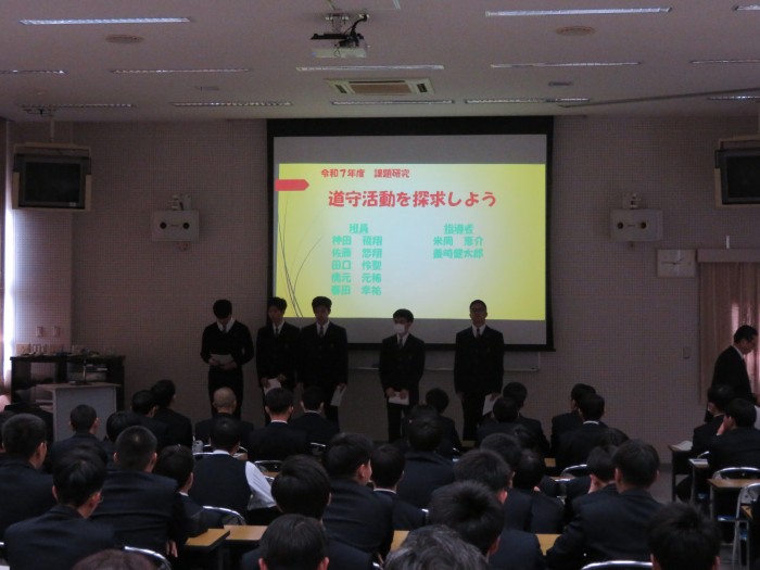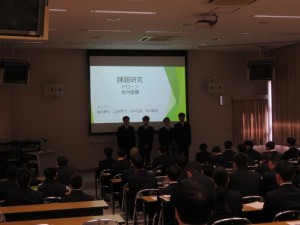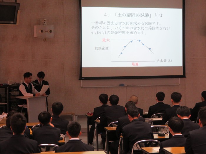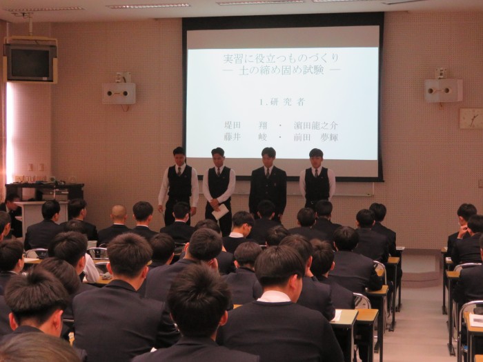 1月20日に土木技術科の課題研究発表会を実施しました。「課題研究」とは、3年生に設置されている科目で、生徒自らテーマを決め、今まで学習してきた知識や技能を活用し、1年間かけて色々な研究や製作を行うものです。