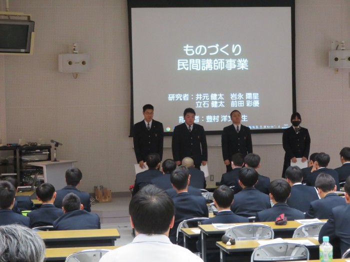 1年間の成果の概要をまとめたレポートを作成し、冊子にまとめ、パワーポイントを活用して発表(プレゼンテーション)を行いました。今年度のテーマは、「実習に役立つものづくり」、「道守活動」、「木工製作」、「ドローンの資格取得と校内整備」、「ものづくりコンテストに向けて・民間講師事業」、「3Dプリンタ・VRゴーグルの研究」でした。今回は、保護者の方や企業の方にも見に来ていただきました。