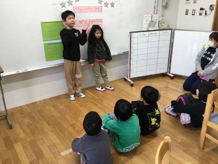 ボール渡しゲームでは、隣の友達にボールを渡していき、ボールが止まった子のポーズをみんなでまねをして盛り上がりました。