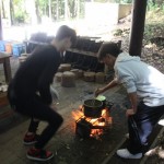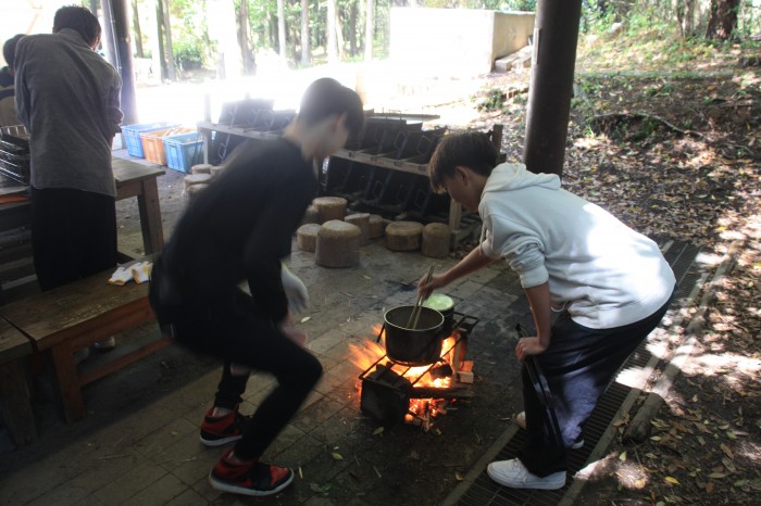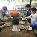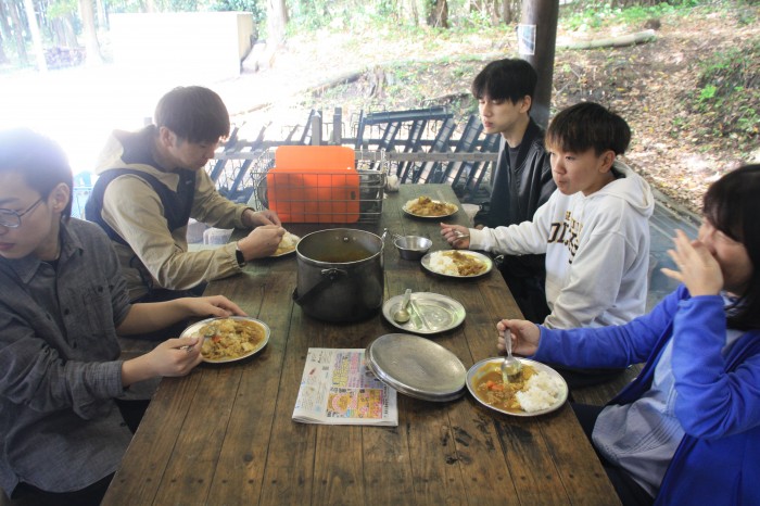 自然の家の職員の方からの説明を受けた後、班ごとに野外炊事を行いました。薪割り・火起こし・カマドつくり・野菜の下ごしらえなど、各班の上級生が役割分担を行いながら班員をうまくリードし、美味しいカレーを完成させることができました。