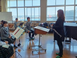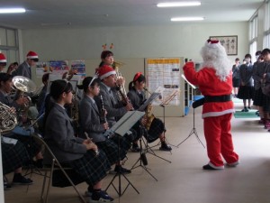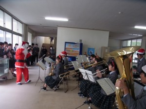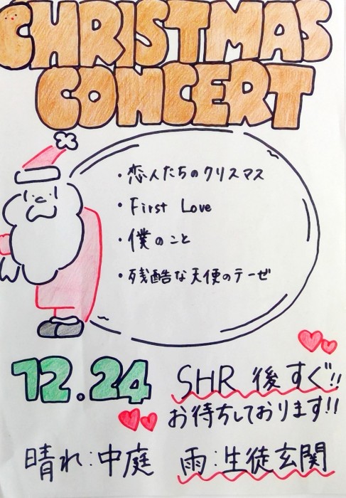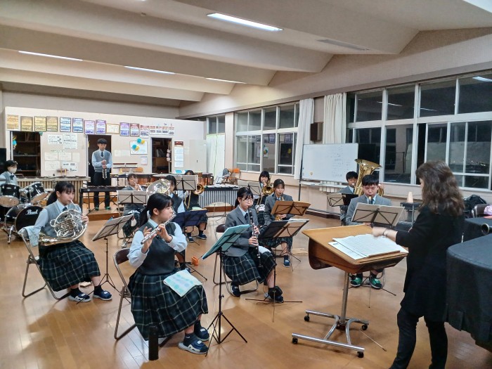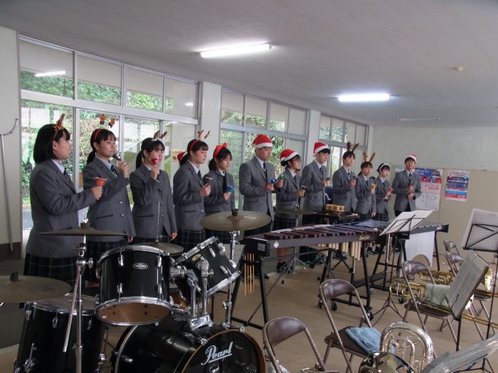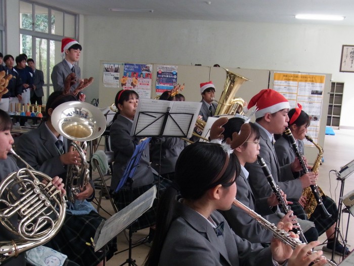 12月24日(水)生徒玄関にて校内クリスマスコンサートを行いました。ハンドベルで「ジングルベル」、合奏で「恋人たちのクリスマス」、「First Love」、「僕のこと」、「残酷な天使のテーゼ」の5曲を披露しました。楽器構成や曲選びに加えてみなさんに温かい気持ちになってもらうため衣装や飾り、ポスター作成など工夫しました。日ごろの練習に加え、12月19日(金)には「NPO愛知室内合奏団」の仲田眞弓さま(クラリネット担当)をお招きして、基礎練習の強化、曲のイメージの作り方や丸い音の出し方など指導していただきました。2025年は猶興館の音作りのために、たくさんの方にかかわっていただきました。そしてたくさんの場所で演奏させていただきました。かかわってくださった方への感謝の気持ち、そして卒業を迎える3年生の先輩方に心をこめて力強く演奏することができました。