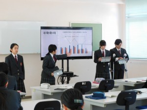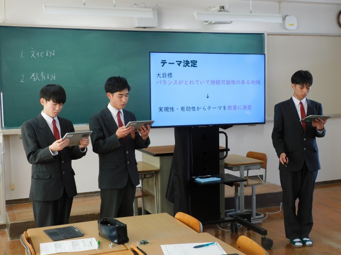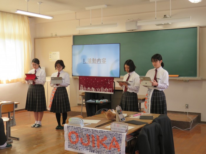 1年生では、小値賀町の「文化」と「教育」の2つの班に分かれ、より魅力的な町にするために行ってきた活動の報告をしました。