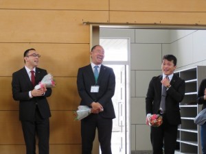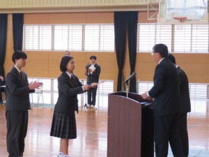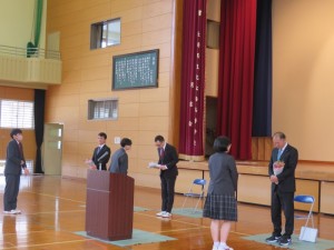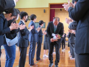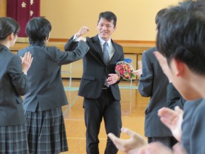 また、離任式では、3名の先生方からご挨拶があり、生徒による花束贈呈と校歌斉唱、花道を作ってのお見送りを行いました。