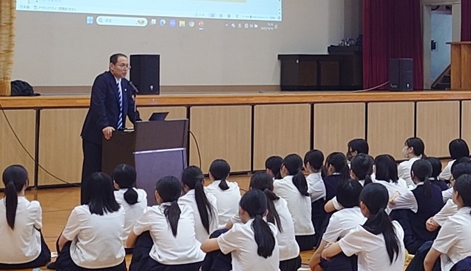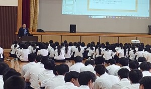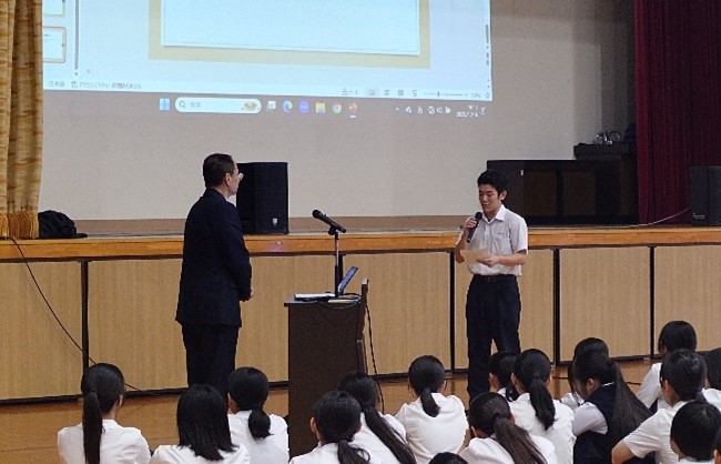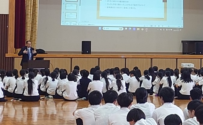 今年度は、壱岐ひまわり基金法律事務所長の 宇佐美 竜介 さんに「法律家(裁判官と弁護士等)の仕事と やりがい」と題して講演していただきました。講演では、裁判所の職員(書記官)になられたきっかけ、さらに弁護士になられたきっかけや裁判に関わる方の生の声を聴くことができる貴重な体験となりました。また、講演後も別室において、生徒への質問に対して丁寧に答えていただきました。