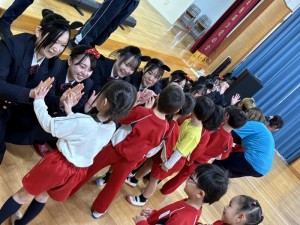 保育分野9名のハンドベル演奏や合唱、絵本の読み聞かせを聴いてもらったり、一緒に手遊びやダンスを踊ったりと楽しいひと時を過ごさせていただきました。また、3年間の学びを実践に生かすことで、これまでの学びを振り返る貴重な経験となりました。