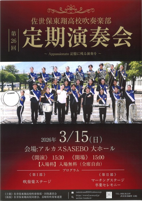 3月15日(日)アルカスSASEBO大ホールにて、佐世保東翔高校吹奏楽部第26回定期演奏会を開催します。15時開場、15時半開演、入場無料(全席自由)となっています。第1部吹奏楽ステージ、第2部マーチングステージの2部構成で日頃、音楽に馴染みのない方々や幅広い世代の方々に楽しんでいただけるようなプログラム構成となっています。工夫を凝らした演出や今年度、初めての企画である卒業生合同ステージ(45名の卒業生が参加します!)にも是非、ご注目ください。部員一同、皆様のご来場を心よりお待ちしています♪