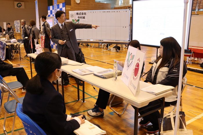 進路を考え始める生徒たちが多種多様な地元企業の中から、自分が「気になる!」と思った4社のブースをじっくり訪問しました。