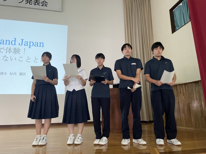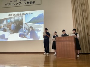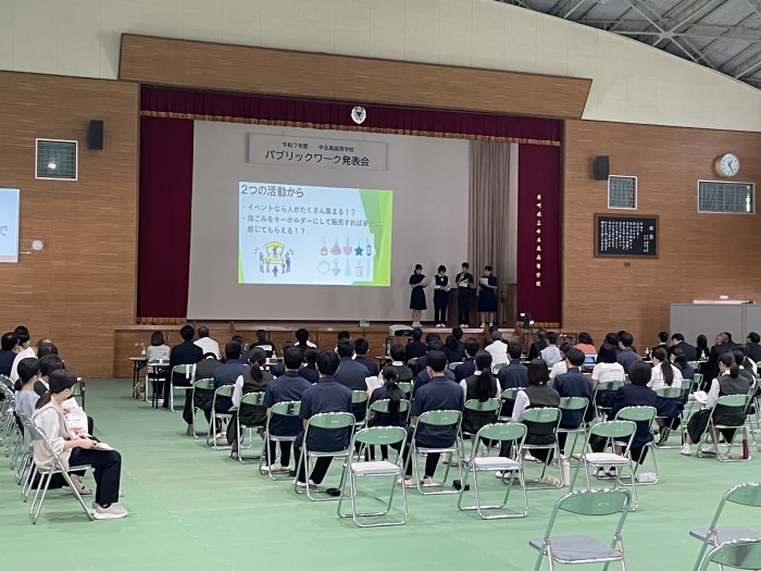 10月23日(木)午後に、「パブリックワーク発表会」を実施しました。地域課題解決型学習として、2学年が中心となって取り組んできました。その成果を、ご協力いただいたアドバザーやサポーターの皆様を一はじめ地域の方々や小学校の児童も参加していただいた中で、発表することができました。