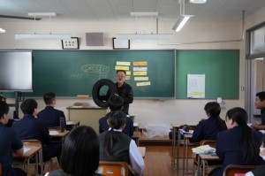宮崎様は、現在、地元新上五島町で自動車整備工場を経営しておられ、地球温暖化対策を踏まえた車作りの在り方、ガソリン車や電気自動車等の動力源の違いによる車の維持に係る経費の比較、中古車購入に際しての留意点、タイヤやフロントガラス等に施された安全対策や環境への配慮等といった車に関わる実用的な知識に加え、「笑顔と感動が大切」といった人生訓やこれまでの御自身の社会経験にも触れられ、今後社会を生き抜いていく上での貴重な情報や人としての生き方・在り方を示していただきました。