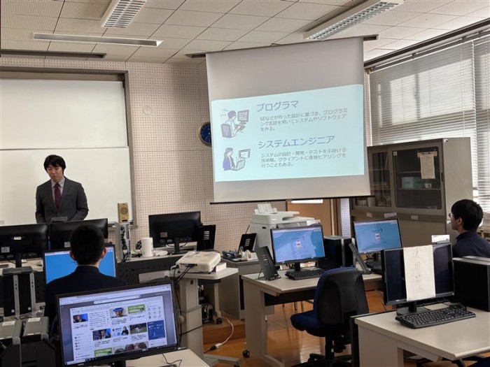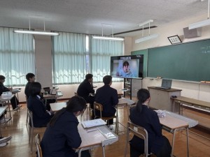 教頭による進路講話、大学・専門学校による進路別ガイダンス、就職希望者に対する筆記・面接試験対策講座、県内企業によるオンライン説明会などが行われました。また、五島灘酒造株式会社の代表取締役 田本 佳史 様にも来校していただき、進路選択への向き合い方や新上五島町における産業のあり方などについてご講話いただきました。
