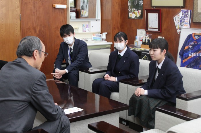 2月26日(木)、模擬会社LiNKの社長(藤本さん)と副社長(中山さん)が新上五島町役場を訪れ、1年間の活動で得た利益の一部を寄附しました。役場では石田町長に寄附金を直接お渡しすることができ、その後は新上五島町の現状と未来について、お話をお聞きすることもできました。