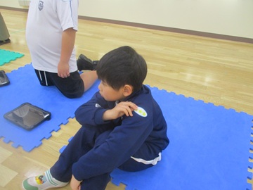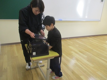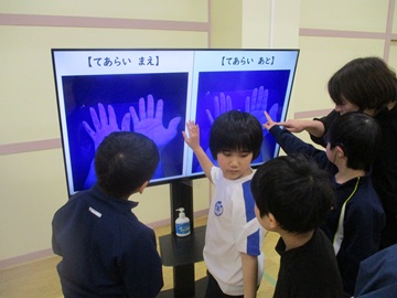 実際に手洗いチェッカーを使って、手についている汚れを目で確認しました。その後は、「とれないとれない!」と