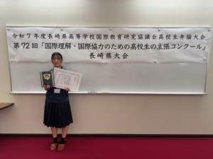 10月20日(月)、国連大学(東京都渋谷区)にて行われた「第72回 国際理解・国際協力のための高校生の主張コンクール 中央大会 (主催:外務省・(公財)日本国際連合協会)」で、本校1年生の中村 真帆(なかむら まほ)さんが、文部科学大臣賞を受賞いたしました。