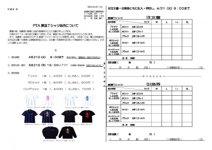 PTAで制作した鹿道Tシャツ・ポロシャツを販売します。注文書は生徒の方へ配付しております。※鹿工祭での販売はありませんので、必要な方はこの機会にご購入ください。