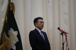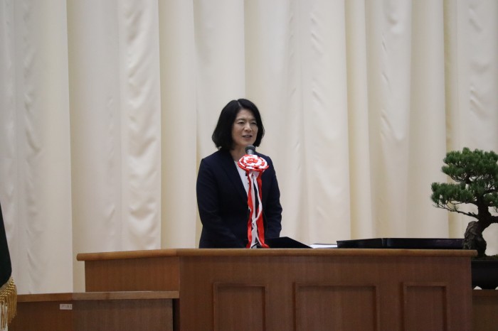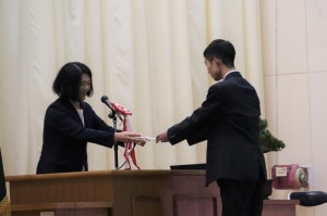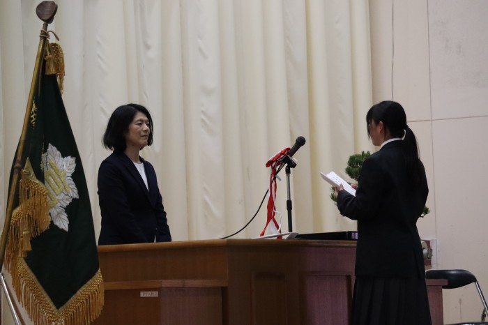 宮木さんに委嘱状が針尾会長より手渡され、川上さんが卒業生を代表して同窓会入会のあいさつをしました。