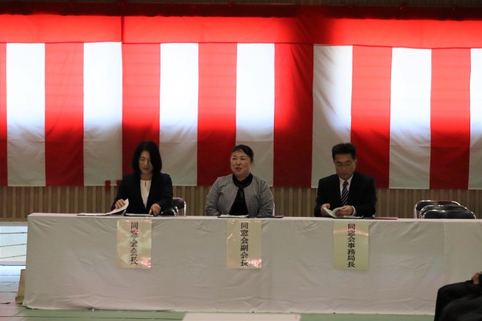 記念品受領を青木創大さんが務め、学年幹事(評議員)として宮木秀さんと川上玲奈さんが紹介され、