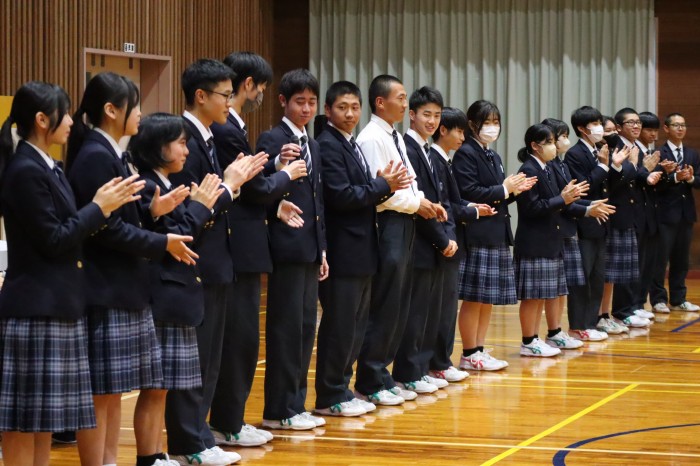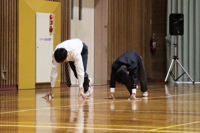 部活動紹介では、陸上部がクラウチングスタートのさまざまなパターンを紹介してくれました。