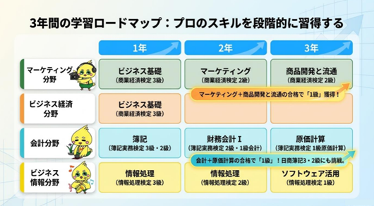 商業科では「知識と技術の習得」「各種検定・資格取得」「進路実現」の三つを軸に、3年間で段階的に専門性を高めていきます。マーケティング、会計、情報分野など幅広い分野を学び、全商検定や日商簿記などの資格に挑戦できる点も大きな魅力です。