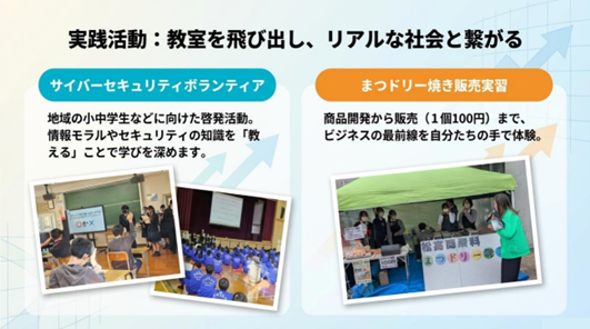 また、商品開発・販売実習やサイバーセキュリティボランティアなど、教室を飛び出した実践的な取り組みも充実しています。