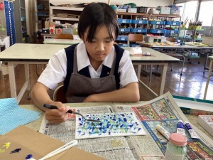 (左)中学部1年生は、思い出の景色を油絵の具を使って描きました。ペインティングナイフを使って