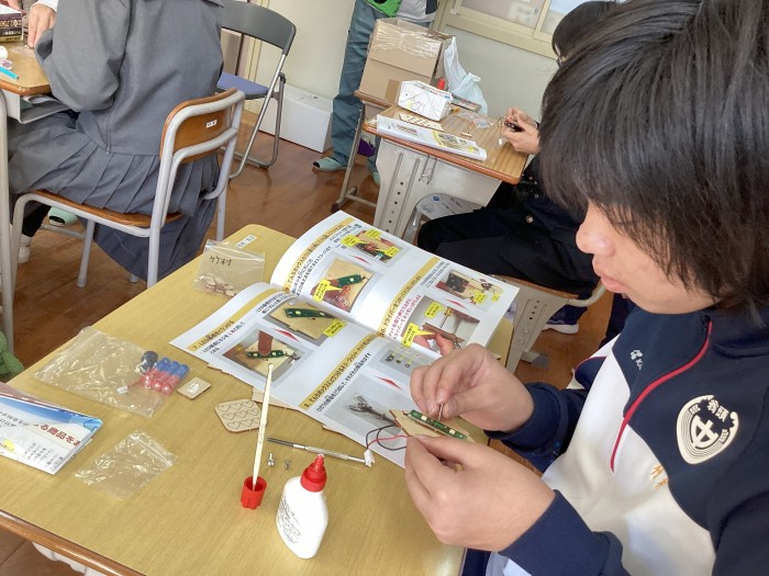 (右)LEDライト制作の講座を受けた時の写真です。工具の使い方や配線の取り付け方などを学びながら