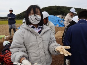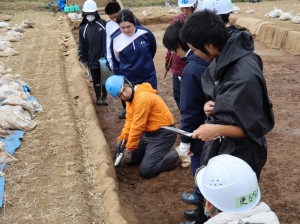 ▲作業員の方から教えていただき、横の人との高さを合わせながら掘っていきます。