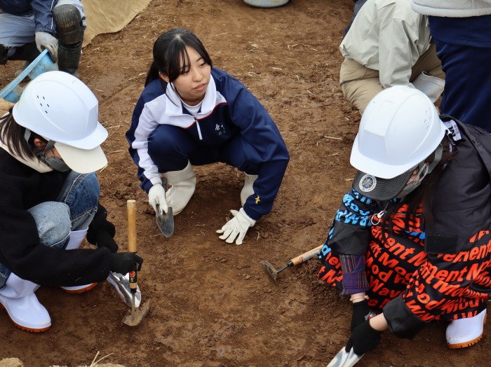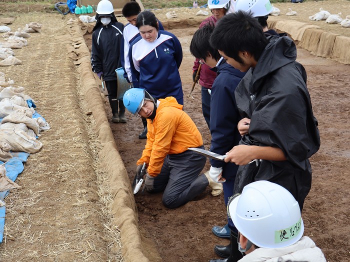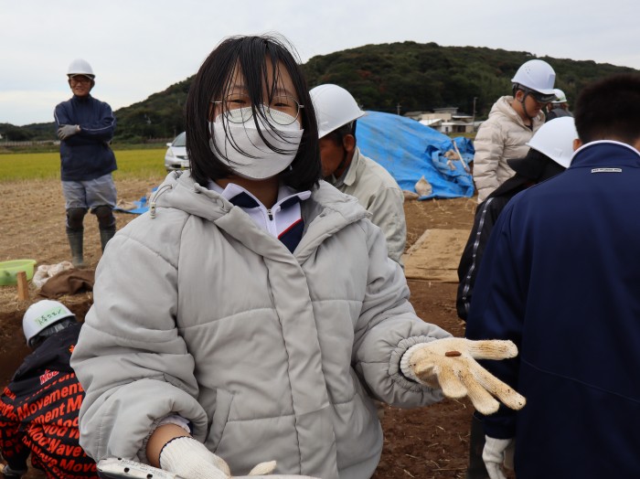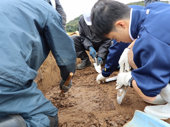 令和7年11月12日(水)長崎県埋蔵文化財センターに指導していただき、東アジア歴史・中国語コースの1年生と歴史学専攻2年生が、「原の辻遺跡の発掘体験」をおこないました。発掘の方法については、生徒一人ひとりに作業員の方々がつき、土器片などを発掘することができました。