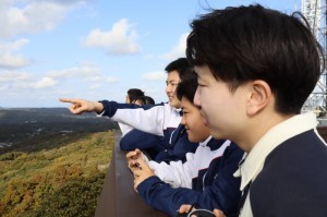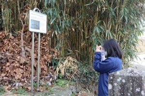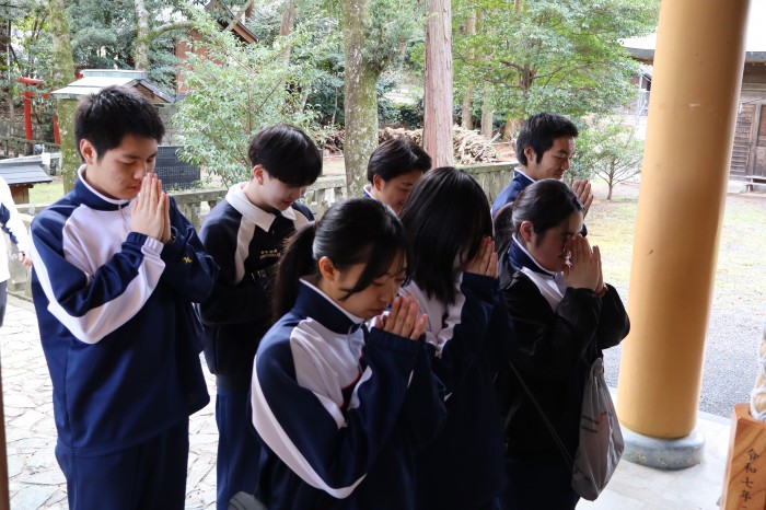 天手長男神社は壱岐の一の宮ともいわれる場所で階段の段数を数えながら登る生徒もいました。住吉神社では境内の「夫婦クスノキ」などを見学しました。車出遺跡にて、地表調査をおこない、弥生土器や須恵器を探し、見つけた弥生土器片に実際に触れて感激していました。最後に壱岐島を一望できる岳ノ辻展望台にて、これまで巡検で訪れた場所の位置を確認していました。