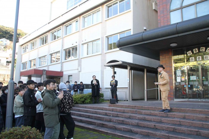 また、全国高等学校定時制通信制体育大会卓球競技において、本校通信制女子団体が令和6年度・7年度の2連覇を達成したことを記念し、PTA・生徒会・同窓会・地元自治会にも協力をいただいてアジサイの植栽を行いました。その下の道を石原氏より「おたくさの小径(こみち)」と名付けていただき、12月22日(金)に命名式を行いました。