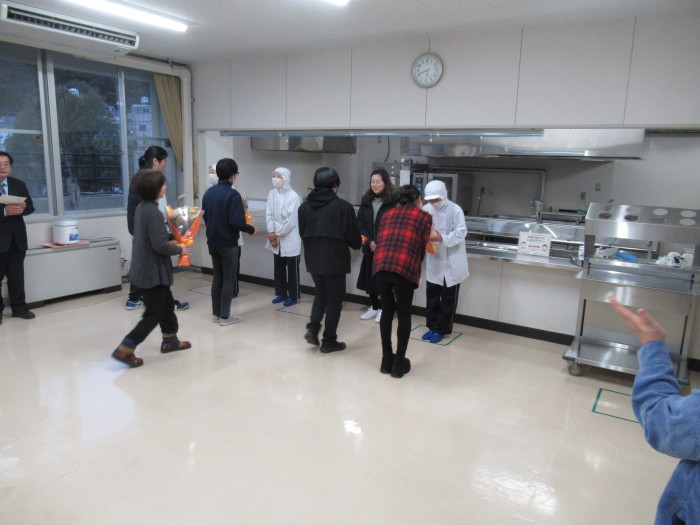 最初に、卒業生を代表して、3年次生の梶原くんと原田さんが、「毎日おいしい給食をつくってくださったおかげで、今日まで頑張って来られました。3年間本当にありがとうございました」とお礼の言葉を述べました。