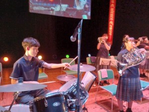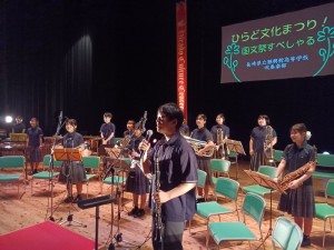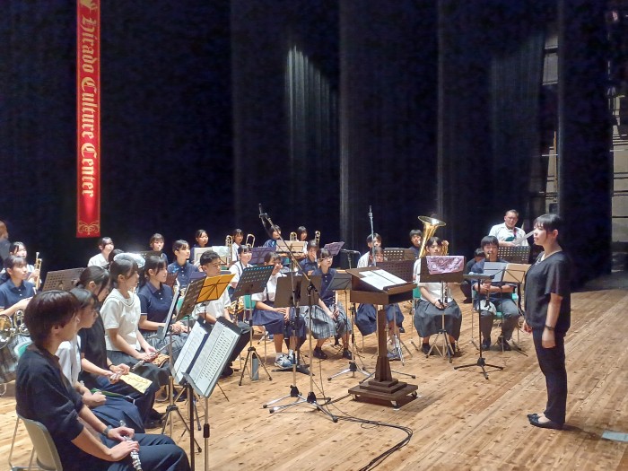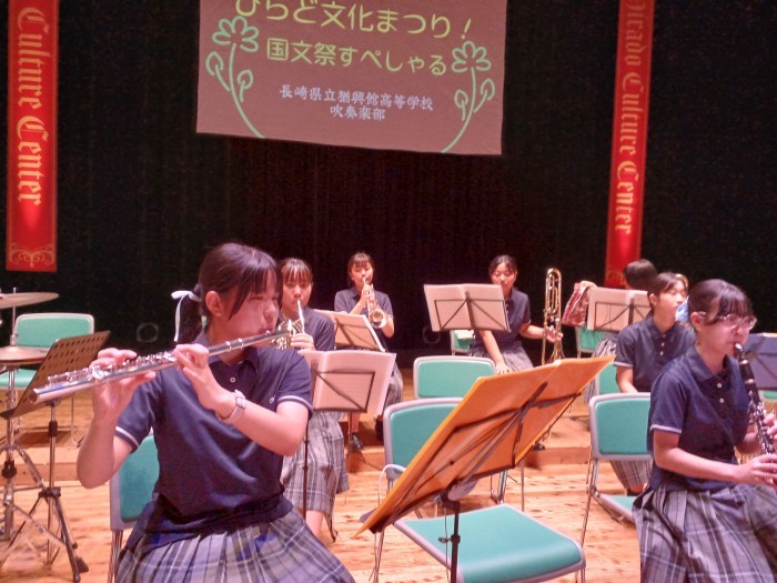 10月4日(土)14:00から平戸文化センター大ホールで開催された「第40回国民文化祭、第25回全国障害者芸術・文化祭 ながさきピース文化祭2025 ひらど文化まつり!国文祭すぺしゃる」小中高生の部で4曲演奏してきました。3年生が引退して初めての大舞台でしたが、堂々とした演奏とユニークな演出で会場を猶興館の音で満たしてきました。夏休みから1曲1曲を丁寧に仕上げるため、生徒同士で何度もセッションを行い納得のいくものに仕上げました。また近隣の学校と合同演奏する機会があり、約40人の大迫力の演奏を体験することもできました。当日の朝のリハーサルや本番までの時間を有効に活用して教えあったり、ステージでリラックスできるように声を掛け合ったりと普段できない体験をすることもできました。応援ありがとうございました。