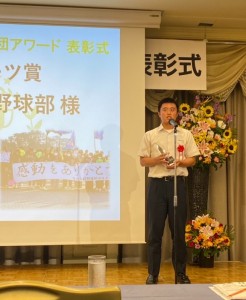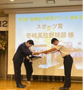 10月5日(土) 第2回長崎松下財団アワード表彰式が行われ、本校の野球部がスポーツ部門で表彰を受けました。長崎松下財団アワードとは、長崎の文化や芸術、スポーツの発展に貢献した個人や団体を表彰するものです。第97回選抜高校野球大会に出場した本校野球部の活躍などが評価され、今回の受賞に繋がりました。今後とも壱岐高校野球部の応援をよろしくお願いします。