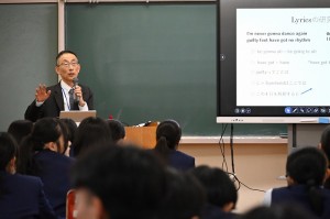 「みなさんがいま学んでいる英語は~洋楽をネタにして~」と題し、大学入学後も学びの中で活きる英語力について講演していただきました。洋楽の歌詞を、今まで培ってきた単語力や構文把握力を駆使しながら鑑賞しました。単なる和訳ではなく、英語のリズムを味わいながら、自分たちなりにあれこれ解釈を巡らす時間はとても楽しく、あっという間の1時間でした。