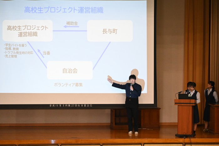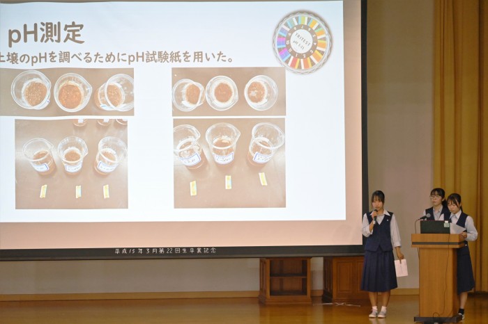 3月の科内発表で選ばれた国際探究の4班、理数探究の8班がステージ発表を行いました。