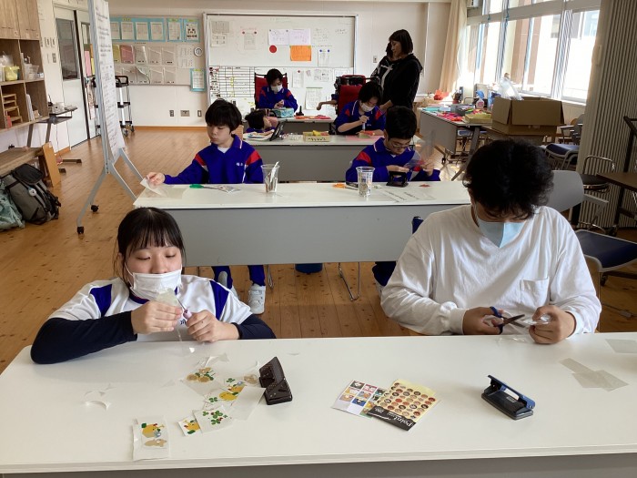1グループ:ラミネートフィルムを用いた制作作業(キーホルダー)