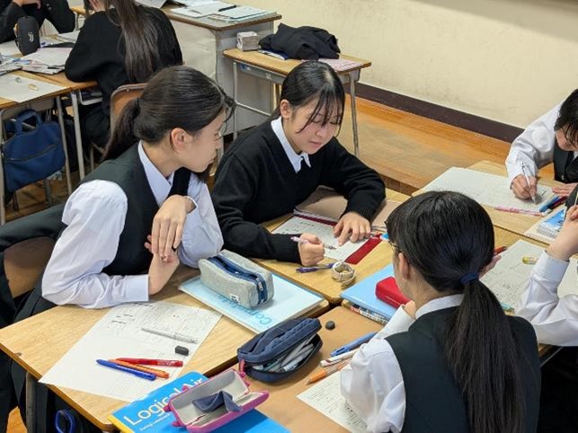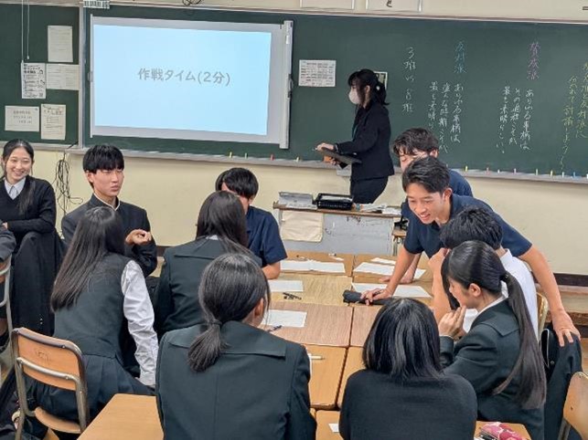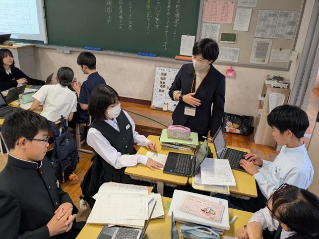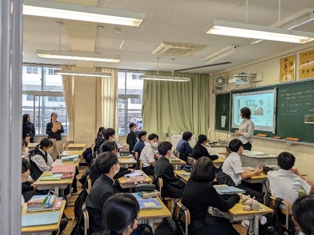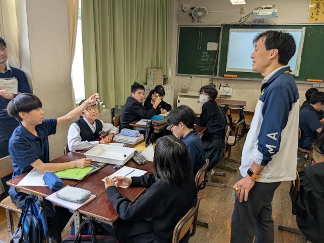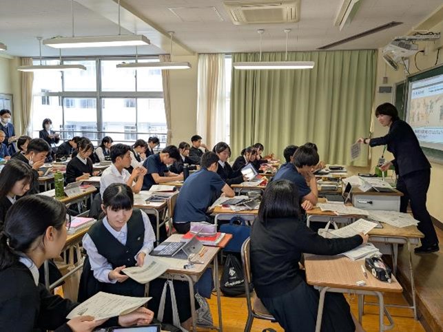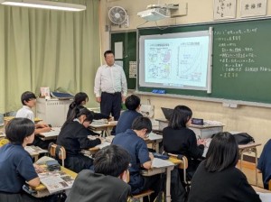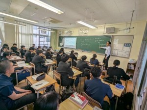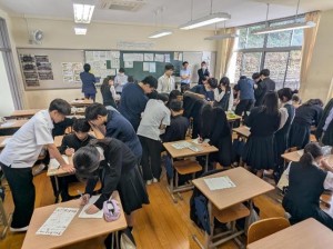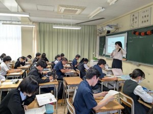 5時間目に中学校の5クラス、6時間目に高校の5クラスで、国語、社会(高校は日本史探究)、数学、理科、英語の研究授業を行いました。長崎県教育庁高校教育課から3名の指導主事が、また、市内外の中学校の先生、高校の先生も授業参観に来られ、授業終了後には各教科で研究協議を行いました。基礎学力の定着と、対話的で創造的な授業を目指した研究授業が行われ、多くの参観者の前で、生徒たちも普段以上に生き生きとした表情で学習に取り組んでいました。