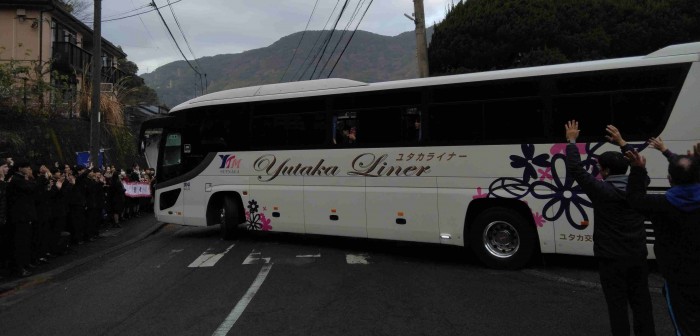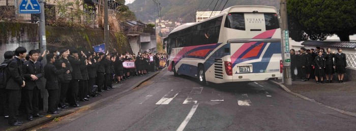 学校から出発する高校3年生の先輩たちを、高校1・2年生が激励と共に見送りました。