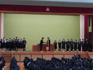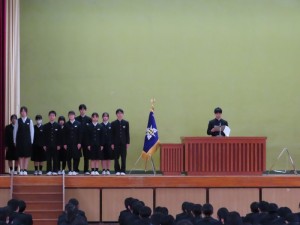旧役員三年生と新生徒会長の挨拶がありました。