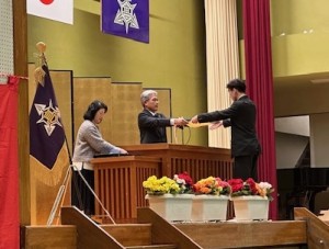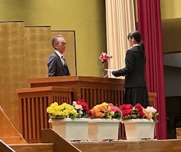 【卒業記念品授与】代表 川上千洋さん ~PTAより卒業証書フォルダをいただきました。
