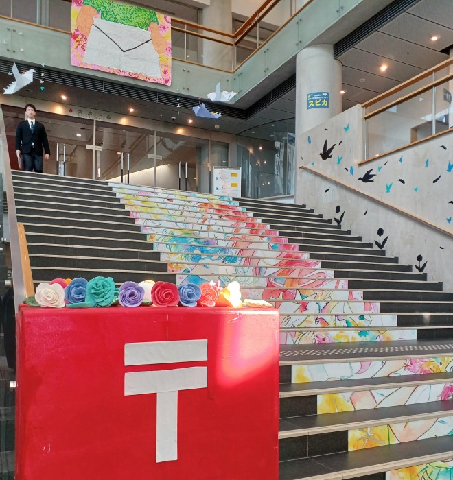 11月7日(金)長崎県高等学校総合文化祭(しおかぜ祭)総合開会式がアルカスSASEBOで行われました。今回は「手紙」がテーマで「手紙を送り合うように、温かい想いをもって人とつながっていきたい」という気持ちが込められています。4月から本番までの約8か月間、生徒たちは式典班、舞台表現班、会場整理班、テクニカル班、空間装飾班、広報記録班に分かれて活動してきました。本校の生徒は装飾班としてアルカスSASEBOの入口階段に貼り絵、手紙を入れるポストなど飾り付けをしました。県北地区の生徒たちと目標達成のため意見を出し合い、作品のアイディアを決めるまでに何度も話し合いました。また各学校でどのような作業ができるか、担当決めや工程の分担など課題に向き合い与えられた状況や条件で「できること」を一生懸命考え完成に導きました。これから文化専門部の活躍も続きますので、各会場で生徒の活躍をご覧ください。