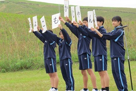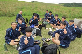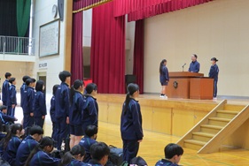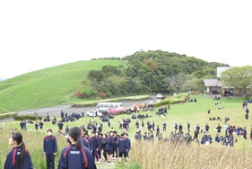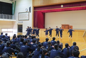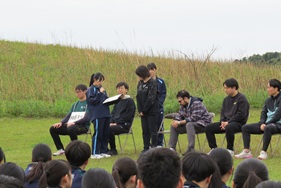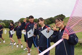 歓迎遠足を実施しました。体育館で、新年度の役員任命式、歓迎行事のダンス披露をして出発しました。到着後は、新転任の先生方へのインタビューや生徒会で企画したゲームを行いました。昼食後には、1年生がクラスごとに作成した連凧揚げをし、クラスで団結してそれぞれの凧はしっかりと空高く揚がりました。