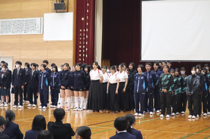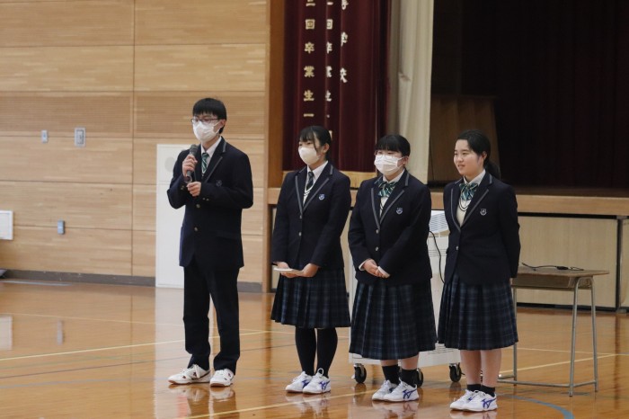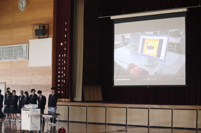 オリエンテーションのなかで、生徒会執行部が企画した部活動紹介と校歌紹介を実施しました。