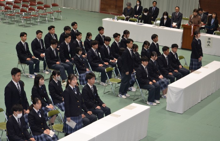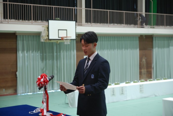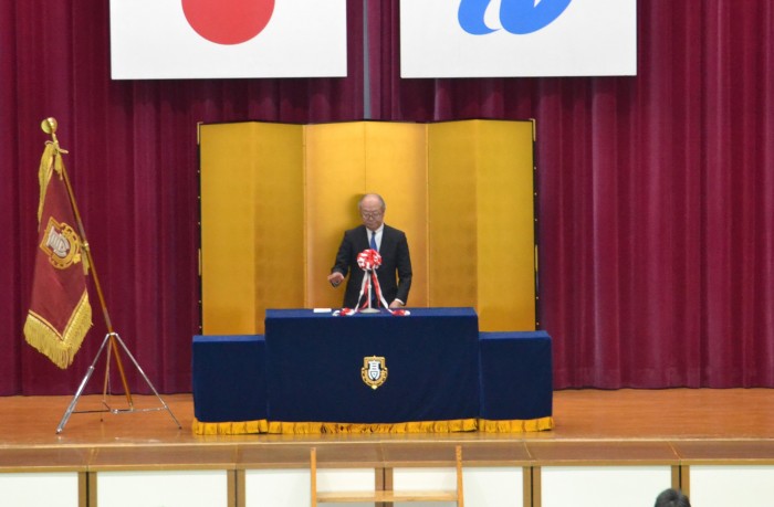 本日、同窓会入会式を行いました。同窓会会長の浅田様から祝辞と卒業記念品を贈呈していただきました。